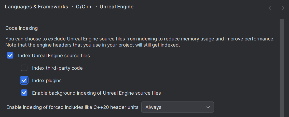 By default âPluginsâ will not be indexed and many common modules of the engine are considered Plugins by Rider including Enhanced Input and Niagara. I would recommend to enable this or they wonât show up in autocompletion and code searches.