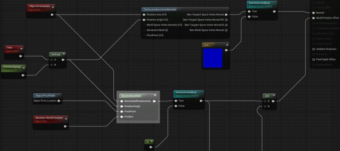 Rotating the vertices is luckily very easy as we have a ready-to-use material node available: RotateAboutAxis. We plug this into World Position Offset with some simple inputs like Time to determine rotation angle, and the objectâs orientation for its rotation Axis.