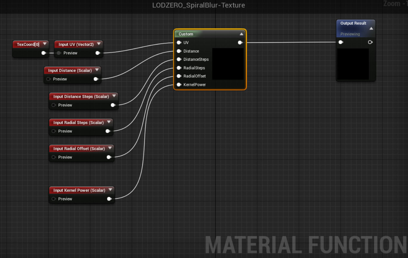 Unfortunately, I couldn’t find any official UE4 documentation on the Spiral Blur node, there is a wiki page on how to use the material node. The built-in implementation takes the scene textures and over several iterations creates….a spiral blur. The default settings are at about 128 iterations, which is pretty heavy! I’ve used this node as a reference to create my own, which samples the Custom Depth buffer instead of the scene color.
