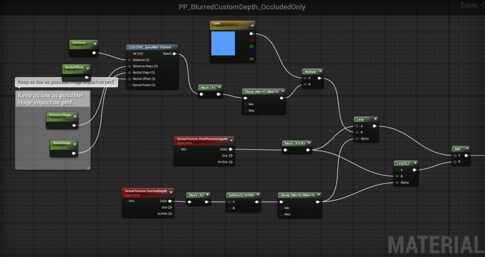 Performance was recorded on a 850M mobile GPU at 1280x720 with ~1.5ms measured and on my GTX 980 Ti it runs at 1920x1080 with 0.8ms for the post process material. It’s heavily depending on the amount of iterations in the spiral blur. You will want to keep the DistanceSteps and RadialSteps as low as possible while maintaining a smooth edge. In the demo I settled on 4 DistanceSteps and 8 RadialSteps which is 32 iterations.